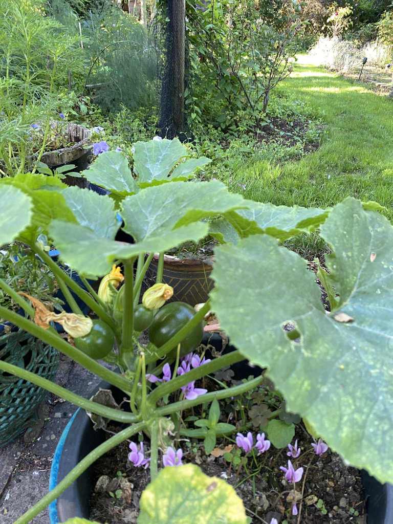 Day three of my week of blogs then to celebrate publication day for Hostile Environments (tomorrow) and today’s plant of the day is the globe courgette which you can see growing here in a pot on me patio outside the writing shed. I’ve never grown a cucurbit in a pot before – they usually go into the ground in beds as they get so big, and I’ve never grown globe courgettes before this year at all. Never saw one before this year in fact, and now they seem to be everywhere – happen someone hybridised them last summer and are knocking the seeds out cheap. The cucurbit family which includes pumpkins, cucumbers, melons and all manner of gourds is very easy to hybridise – in fact if you gather then keep the seeds from year to year, you never know what you’ll get the following summer. They have male and female flowers that are fertilised by flies that spread the pollen. No fertilisation and the fruits just stay small and drop off, fertilised and they swell into whatever. I planted these globe courgettes in a pot because I forgot to label them as seeds in the greenhouse and wasn’t sure what fruit they would yield until they started to appear and was pleasantly surprised when they became these lovely shiny deep green beauties. They are very good for stuffing and roasting – even the skin in crispy delicious done in the air fryer. What I didn’t expect when growing them, was the early advent of the wee cyclamen underneath. These gorgeous pinky petals usually only poke through much later in the year, bringing showers of pink and red and white to garden as the days start to darken. I’m thinking maybe the shadow cast by the huge green zucchini leaves tricked them into thinking it’s October and so out they popped – and they look so lovely there like a younger, sibling basking in the protective shade of their older sister – which lead me to thinking, on this book-publication-day eve, how stories can change depending on where they are placed inside a book and how they are set on the page. Flash fiction of all the prose forms is the one most aware of how it exists as a form or a shape I reckon. Not always though – sometimes a great flash is a great story written in the (brief) form of a story with a beginning, a middle and an end (in that order). But so often it’s not. So often flash sits on the page aware of the page – like a poem does, making its shape part of the story telling even. In recent times this sort of flash has been called hermit crab flash because – well you can see why – because hermit crabs borrow their shells – but I like the term hybrid flash better because quite often non-conformist flash fictions don’t borrow a shape , they are the shape. The storytelling, the beating heart of the story – its life and soul comes from the shape – it’s not an afterthought or tacked on afterwards. Here’s one of my flash fictions that does what I just described. How it sits on the page, the blank spaces in between the words even, the pause and moments of quiet, the emptiness are all part of the intrinsic storytelling. And so too is the juxtaposition of the form and story which at once jar against each other and meld together – a bit like the lovely cyclamen and the huge courgettes – strange but satisfying flower bed fellows. But before you read it – I just remembered that, yet again I’ve not mentioned that bloody PhD application thang I’ve been banging on about for three days now. Tomorrow it will have to be…