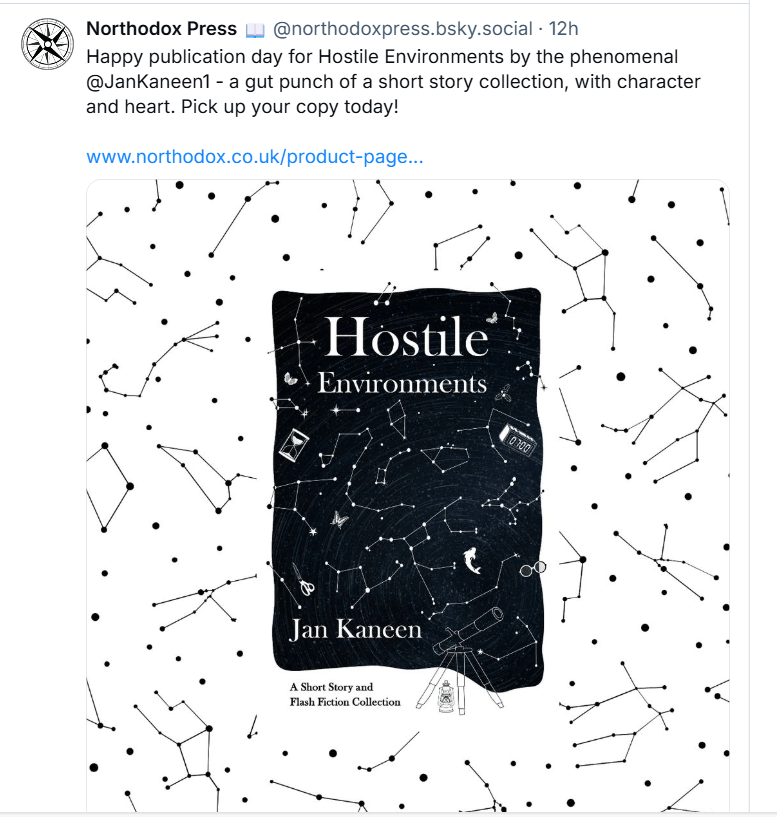 Anyhoo, back on planet earth, last week, I did an interview with the folk at Northodox about writing and creating. Here’s the link if you fancy having a read https://www.northodox.co.uk/post/author-interview-jan-kaneen and if you do feel moved to pre order a copy of Hostile Environments all the deets are there.