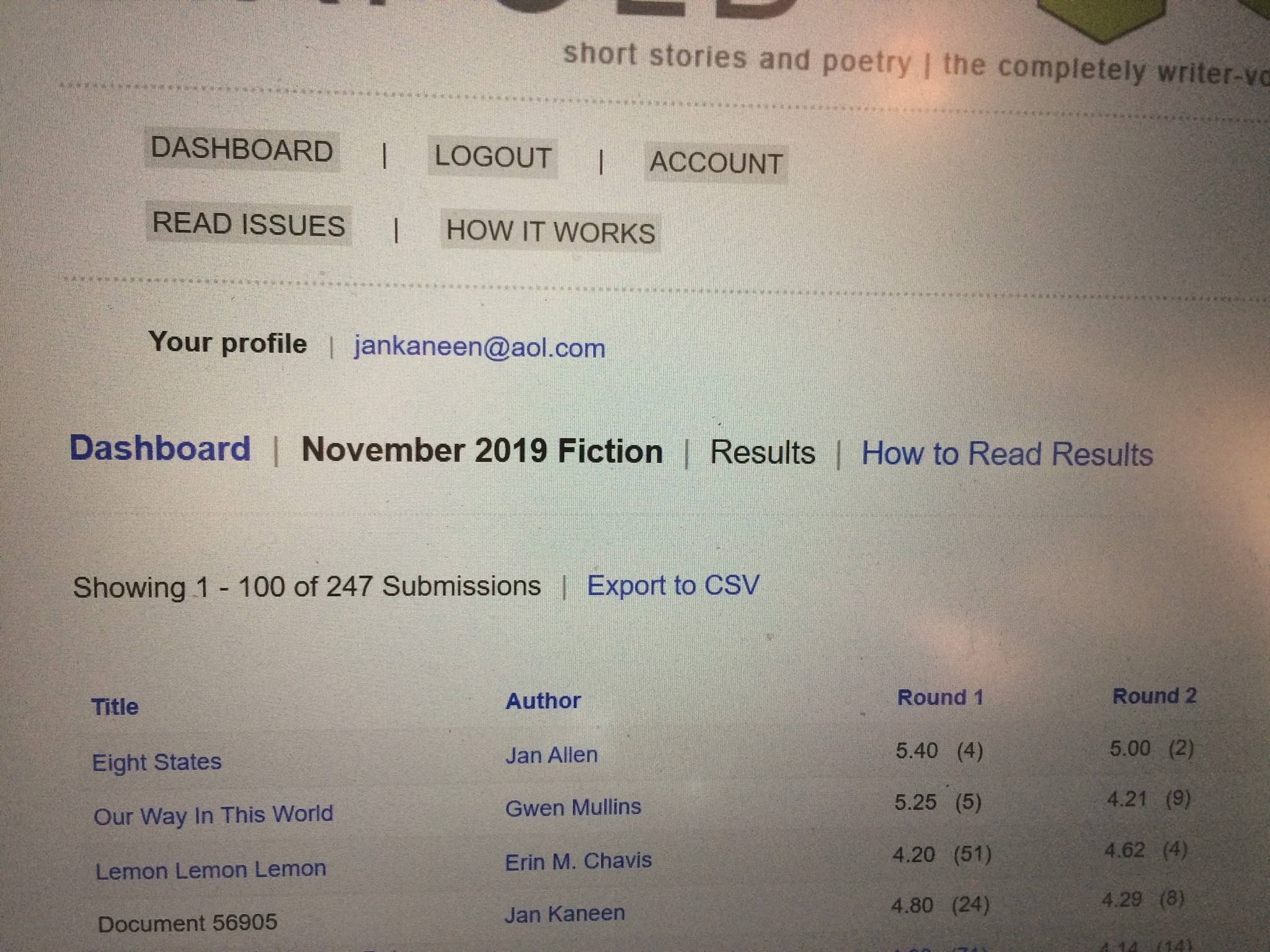 h of which said the same thing. As a result, I’ve decided to improve the story in line with the comments received and enter it into comps next year to see how it does. This is the first time I’ve turned down an offer of publication, but the nature of this comp with its expert critiques and the positivity it made me feel about my story (which I wasn’t all that sure about before) and also that it allows you to opt in or out and to remain anonymous and/or not name your story if you choose not to, (as you can see from the results above) really makes me want to see how the story can do out in the world of more conventional comps. I’ve really enjoyed engaging with this comp. It costs $5 and is worth every penny even if you don’t win the $1000 prize. Having said that I think it would be better if the money was divvied up a bit more – so second and third at least are rewarded with cash too. Like at Retreat West. Here’s my running-up watery flash from there which was published a couple of weeks ago. https://www.retreatwest.co.uk/the-fairytale-ending-by-jan-kaneen/