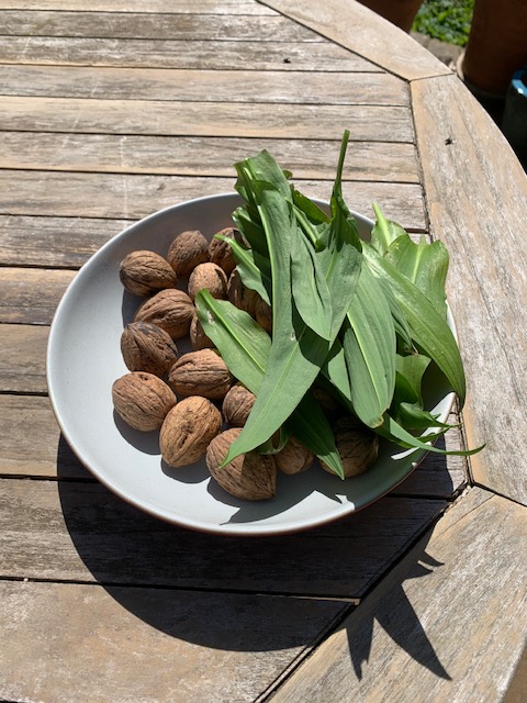 Fast forward a year, and it’s done quite well. So last Thursday, on publication day for my memoir-in-flash, when I was feeling a potent mixture of excitement, anxiety, exposure and pride (the kind that comes before a fall my worry-warting thoughts were thinking) I absented myself from everything to do with writing and attempted ramson and walnut pesto. To be fair I’d never actually tried ramson pesto in my youth because pesto hadn’t made it to 1970s Bolton, but I had seen a recipe in cyberspace. So, as we still had a few walnuts left over from last year’s glut, I reasoned project pesto would feed three birds with one metaphorical peanut: use up some walnuts, do what I sort-of promised grumpy husband a year ago and act as a distraction/avoidance from the emotional maelstrom of publication day. This is what I did.
