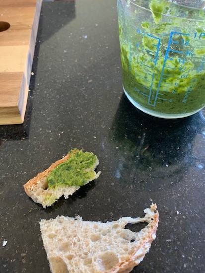 Here’s a picture of a wee bit of pesto popped onto a slice of sourdough for your visual delectation. Wish you could smell and taste it because it really is very pungent and delicious. After I took this photo, I sterilised a repurposed jam jar were I reckon the pesto will store for several weeks kept in the fridge. Grumpy husband was well impressed and enthused that it was one of my best garden preservations ever. Next year, if the ramsons have spread like they do up north, I’ll make bigger batches and see if it freezes okay.