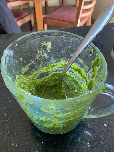 - Whizzed up 50g shelled and toasted walnuts with the juice of half a lemon. I just used a hand whizzer, not a fancy food processor or anything, then drizzled in some local rape seed oil still whizzing until it looked like pesto consistency.