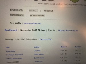That’s why I was so very pleased to come 4th in this winter’s Sixfold competition because its not judged by the few, but the many – by all participants – who rank 6 stories at a time in order of preference and give feedback too about what they felt worked and didn’t story-wise. The highest scoring stories go into round 2. The highest in round 2, go into the final round and the top 20 are published (subject to writer consent. You don’t have to if you don’t want, and as only the first place writer wins a cash prize, I’ve opted not to.) This time around 250 people entered and as I made it through to the final round I received loads of brilliant feedback much of which said the same thing. As a result, I’ve decided to improve the story in line with the comments received and enter it into comps next year to see how it does. This is the first time I’ve turned down an offer of publication, but the nature of this comp with its expert critiques and the positivity it made me feel about my story (which I wasn’t all that sure about before) and also that it allows you to opt in or out and to remain anonymous and/or not name your story if you choose not to, (as you can see from the results above) really makes me want to see how the story can do out in the world of more conventional comps. I’ve really enjoyed engaging with this comp. It costs $5 and is worth every penny even if you don’t win the $1000 prize. Having said that I think it would be better if the money was divvied up a bit more – so second and third at least are rewarded with cash too. Like at Retreat West. Here’s my running-up watery flash from there which was published a couple of weeks ago. https://www.retreatwest.co.uk/the-fairytale-ending-by-jan-kaneen/